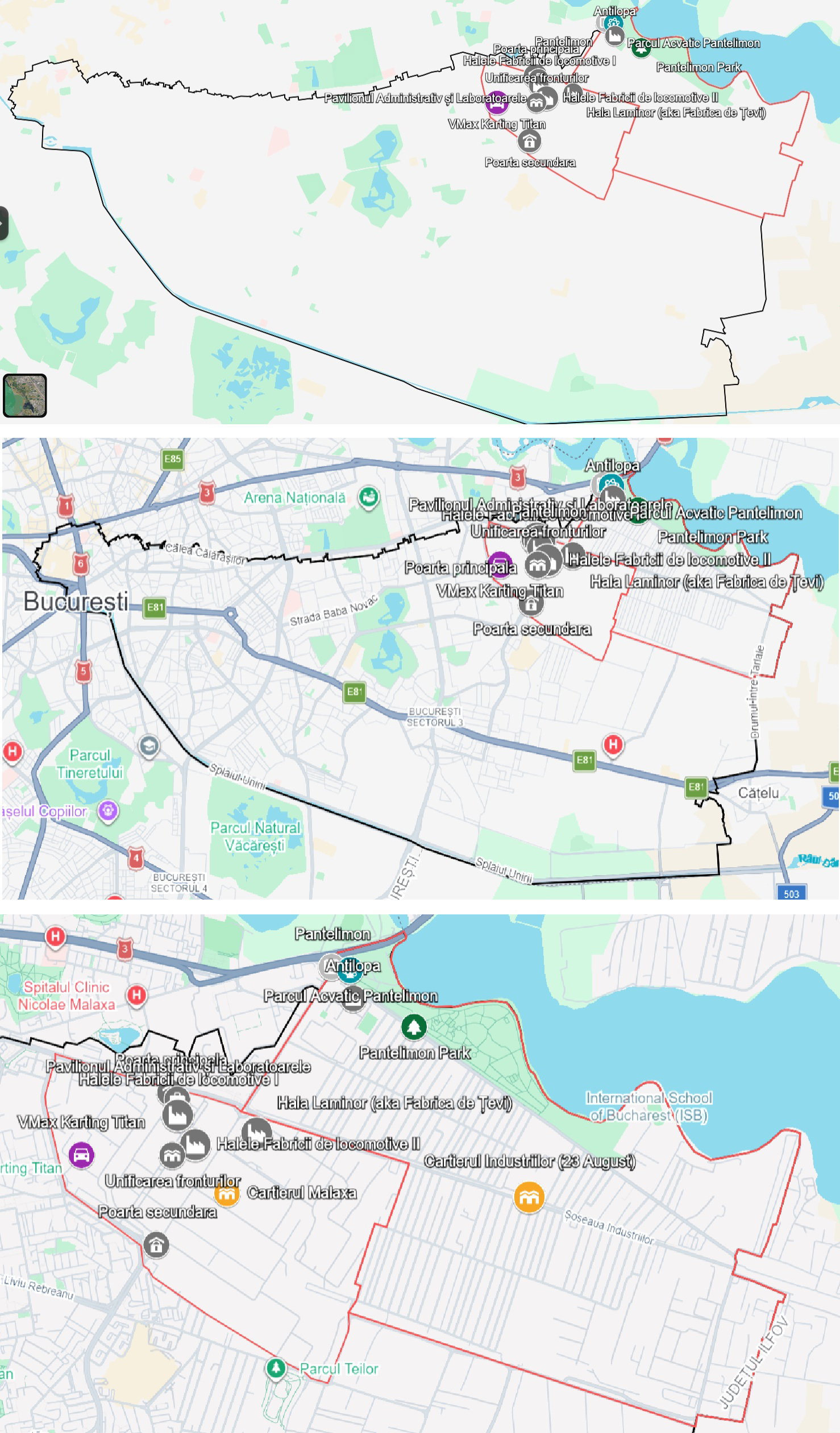 As you can see, the points of interest for a nearby visitor are concentrated in the northwestern corner of the neighborhood, where we find Pantelimon metro station, the Antilopa building, the future aquapark, and the park.