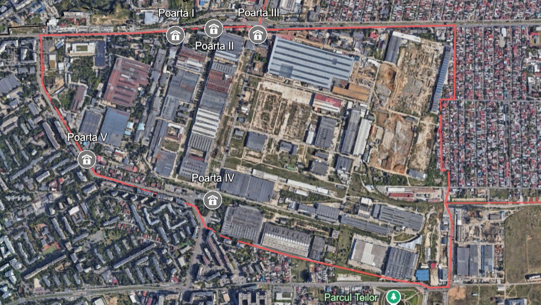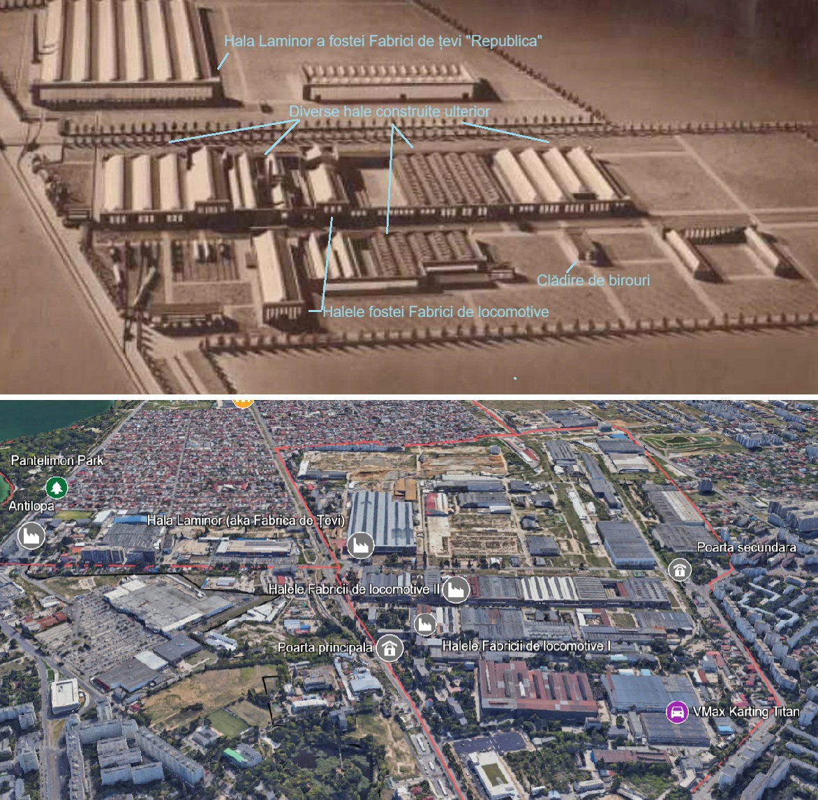 At the far end, toward Gate 2, we can see the first halls of the Locomotive Factory, which form the original nucleus of the industrial ensemble, built in the late 1920s after the purchase of the land near Titan CFR station and the launch of rolling stock production.