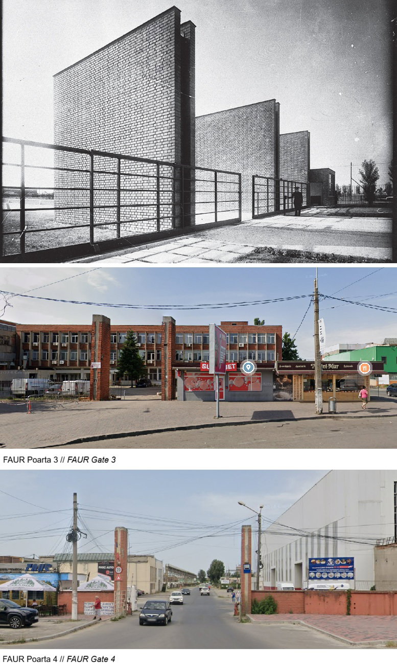 Ceea ce se numește astăzi FAUR Poarta 1 era, de fapt, o poartă de ieșire atunci când a fost gândit complexul, nu poarta principală, lucru sugerat și de scrisul invers, care trebuia citit din interior. Toate porțile aveau însă aceleași elemente monumentale, cu stâlpi simpli de cărămidă, impunând simetrie și echilibru.