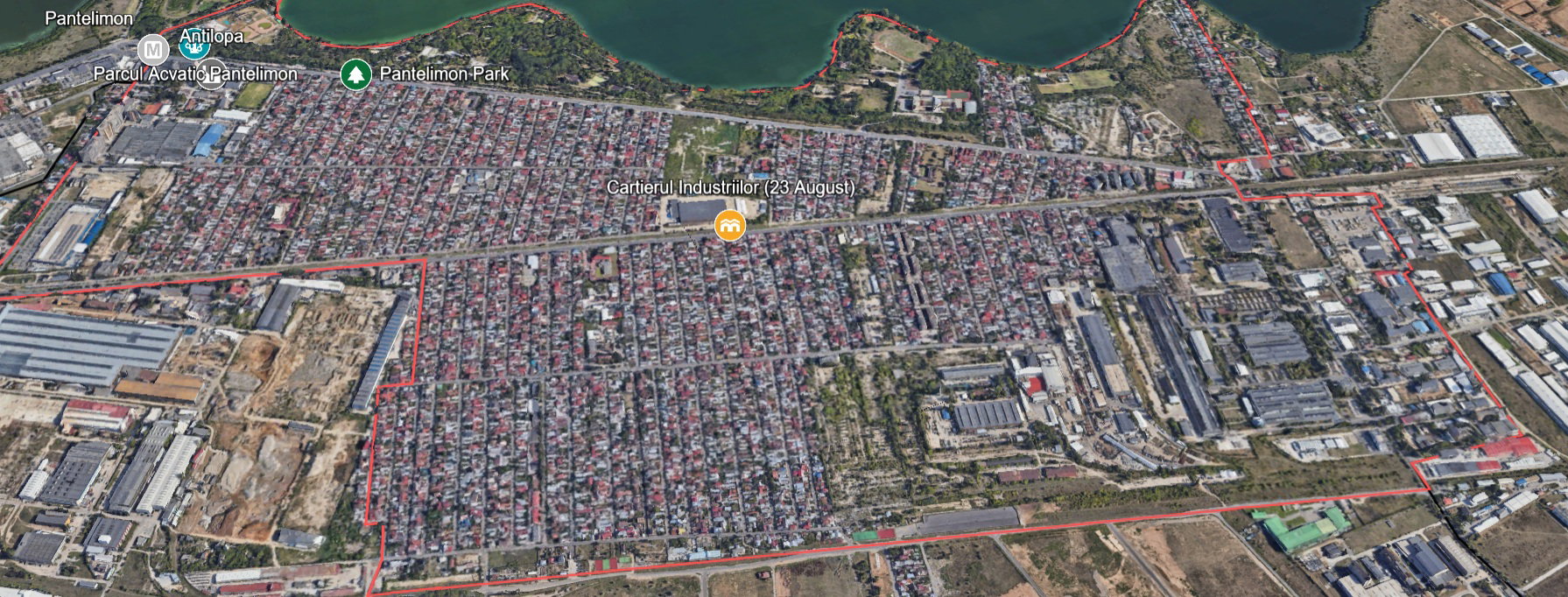 It is bounded to the west by Șoseaua Dudești-Pantelimon, to the southwest by the Faur neighborhood, to the south by Drumul Gura Bădicului, to the east by the border with Ilfov County, and to the north by Lake Pantelimon, which is also in Ilfov. The neighborhood is crossed by two major roads: Șoseaua Industriilor, the one we already entered on, and Șoseaua Gării Cățelu, which runs parallel to the beautiful Pantelimon Park.