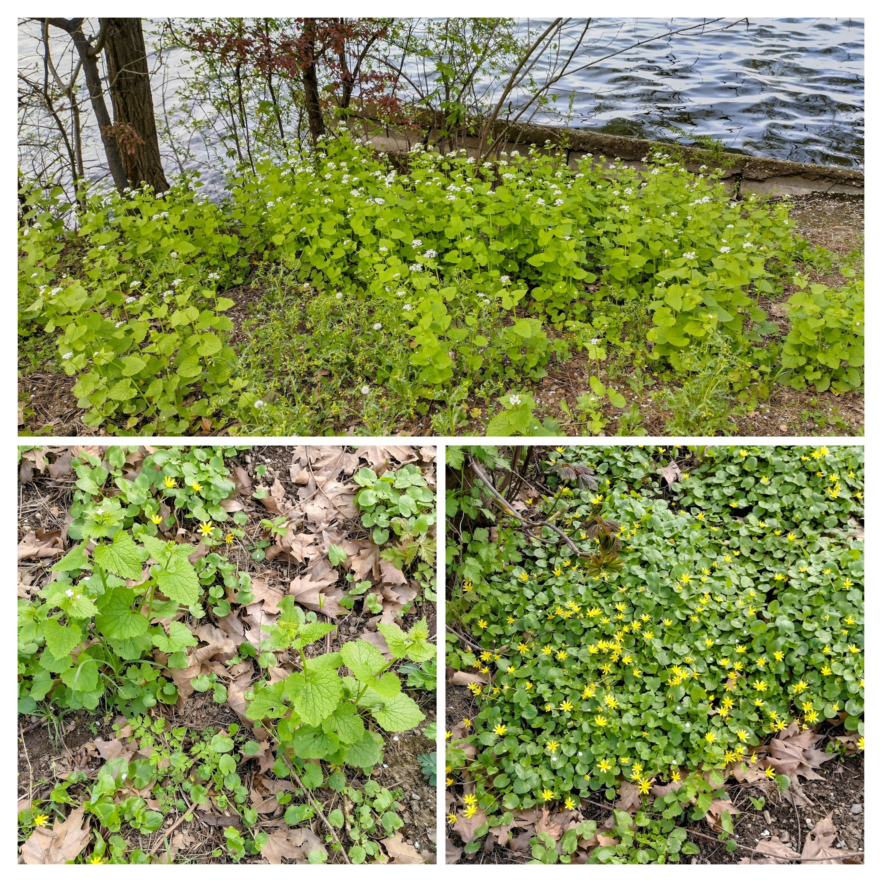 Sus și în stânga: usturoiță (Alliaria petiolata); jos, în dreapta: untișor (Ranunculus ficaria) // Top and left: garlic mustard (Alliaria petiolata); bottom right: lesser celandine (Ranunculus ficaria)